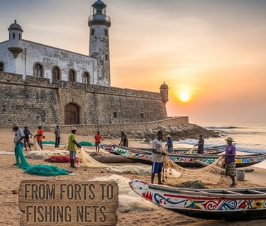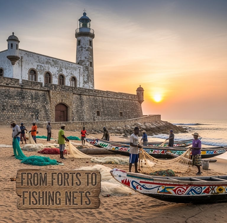 The presence of these forts resulted in the renaming of Soko and Aprang to Jamestown and Ussher Town respectively (Nunoo-Amarteifio, 2015). Jamestown, also called Ngleshie (English Town), owes its very name to James Fort and the long history of Atlantic trade that reshaped this shoreline.